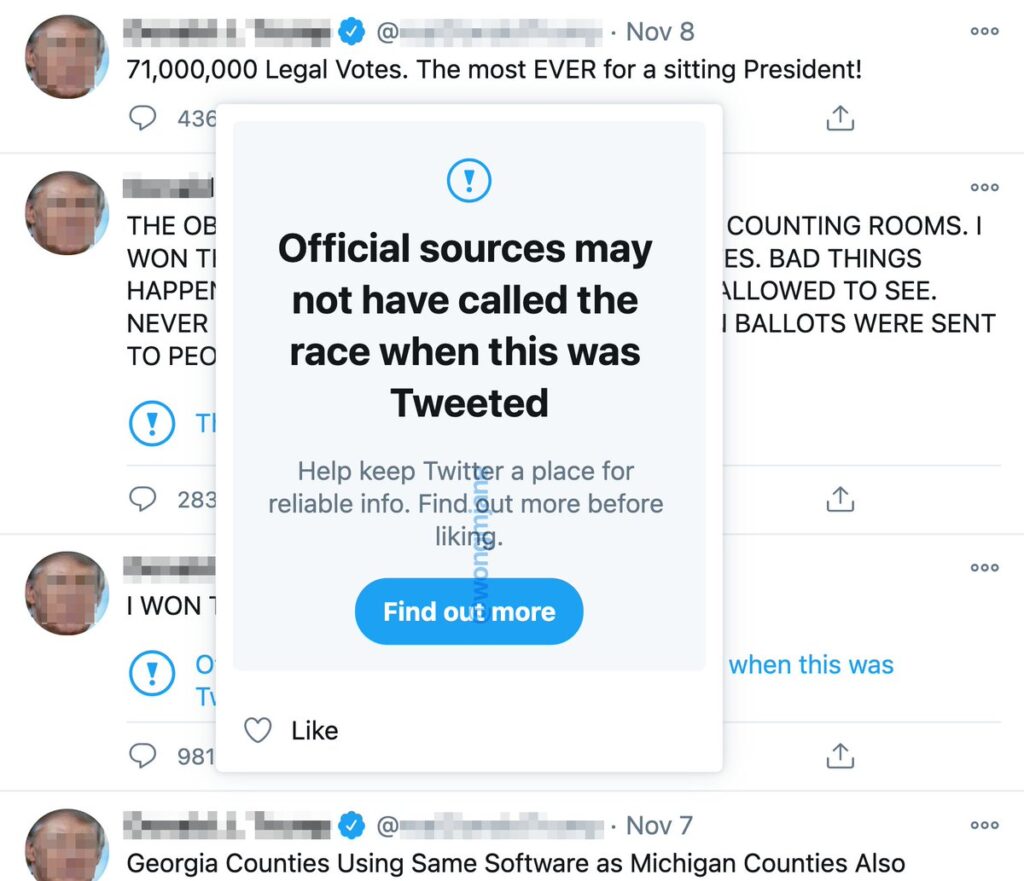 ทีมงานยังเผยข้อมูลเสริมว่าหลังเลือกตั้งสหรัฐ 1 สัปดาห์ มีกว่า 3 แสนโพสต์ที่เป็นข้อมูลผิดๆเกี่ยวกับการเลือกตั้ง และมี 465 แอคเคาท์ที่ถูกบล็อคไปจากเรื่องนี้